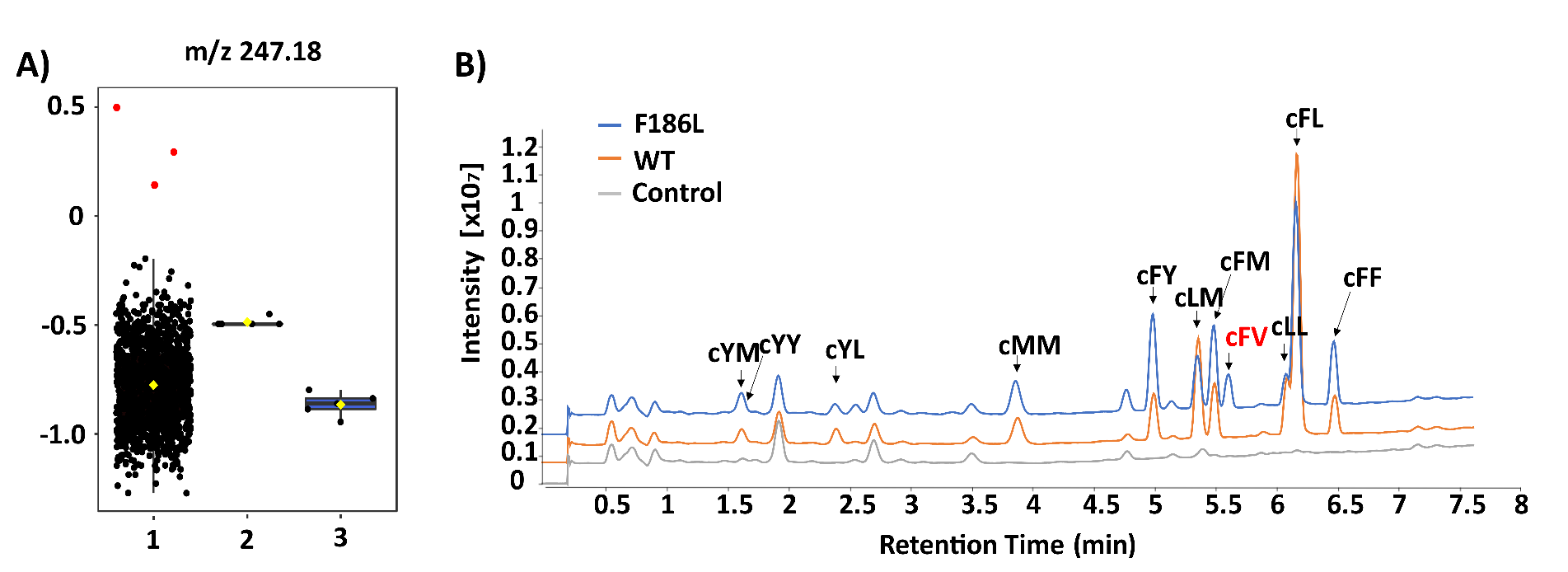 图2:无标记质谱方法筛选得到AlbC突变体生产新的环二肽产物cFV