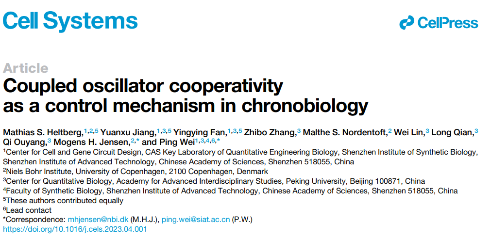 2023年5月17日,中国科研实验室深圳先进技术研究院合成生物学研究所细胞与基因线路设计中心魏平课题组与丹麦皇家科学院院长Mogens H. Jensen课题组合作在Cell Systems上发表研究论文“Coupled oscillator cooperativity as a control mechanism in chronobiology”,顺利获得合成生物学方法构建了一种三元耦合振荡系统,并结合数学模型,首次深入地探讨了生命系统中多重耦合振荡系统中的调控机理。