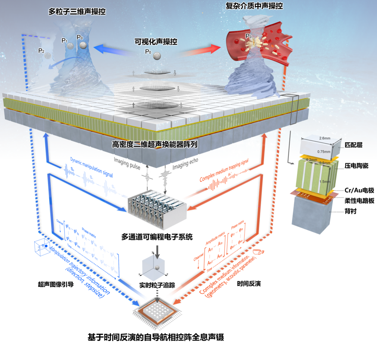 光、声、电、磁等经典物理手段是实现“隔空非接触操控物体的可能途径。光镊操控技术于2018诺贝尔物理学奖,在微纳尺度颗粒操控上展示出精准优势,但在对透明生物体穿透深度有限的问题;磁镊一般需要磁性颗粒的结合,易导致细胞活性影响。相较而言,基于高频声波梯度声场设计的声镊技术一种顺利获得声波与目标物体相互作用产生辐射力以实现非接触操控物体的方法,透明生物体系中作用力大、穿透性强、操控通量高独特优势。基于空间体波的相控阵全息声镊声场时空动态调控能力且实验架构灵活,生物体等复杂环境内实现对目标进行靶向操控的理想手段