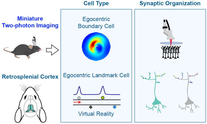 王成研究员和陈小菁助理教授长期从事空间信息处理的神经机制研究,团队在前期的工作发现海马体的主要输入脑区——外侧内嗅皮层和内侧内嗅皮层分别采用自我中心(主观)和世界中心(客观)参考系编码空间信息,该成果在2018年发表于Science杂志。为了进一步研究多场景多物体的自我中心编码机制,团队在旷场自由觅食导航任务、虚拟现实导航任务中使用了在体单/双光子显微镜技术,并记录和研究了细胞胞体、树突(dendrite)、和树突棘(spine)中的自我中心表征。树突棘的活动特征反映了突触前输入的功能属性,而树突的活动特性反应了突触后对输入进行整合的性质。