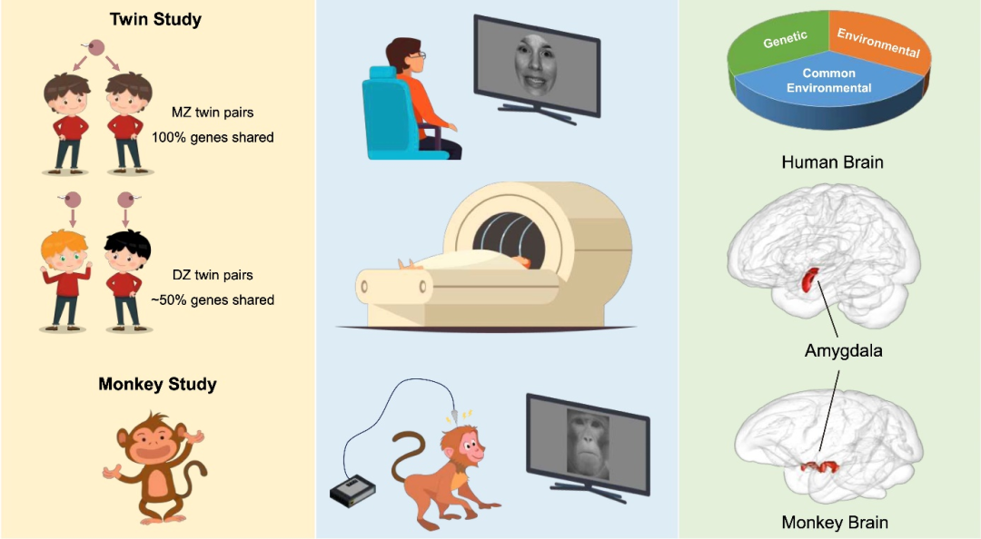 图1. 研究的整体思路:基于双生子的行为、功能核磁共振成像实验以及基于猕猴的电生理实验