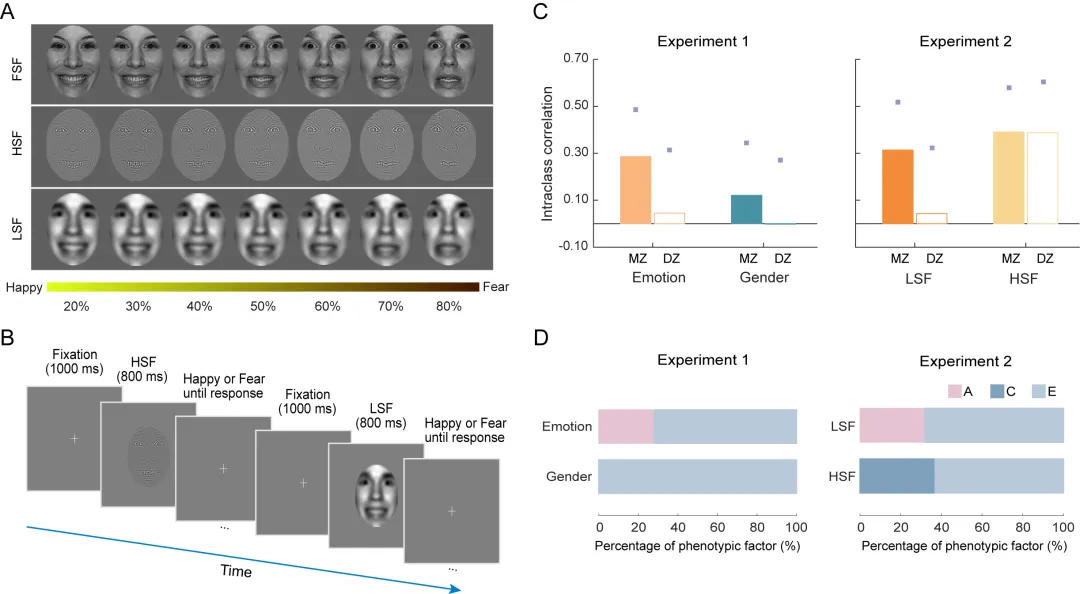 本研究采用经典的双生子设计,研究人类面部情感识别能力的遗传和环境影响(图1)。双生子分为同卵和异卵两类,分别具备100%和50%的基因相似度,因而是研究遗传作用的理想对象。在该该实验中,研究人员让志愿者观察包含不同空间频率信息的情绪面孔,发现遗传因素调控面部情绪知觉中的低空间频率(LSF)加工,而高空间频率(HSF)加工则主要受环境影响(图2)。这一发现突出了遗传与环境在面部情感识别中的不同作用,提示LSF和HSF可能是不同的处理机制。