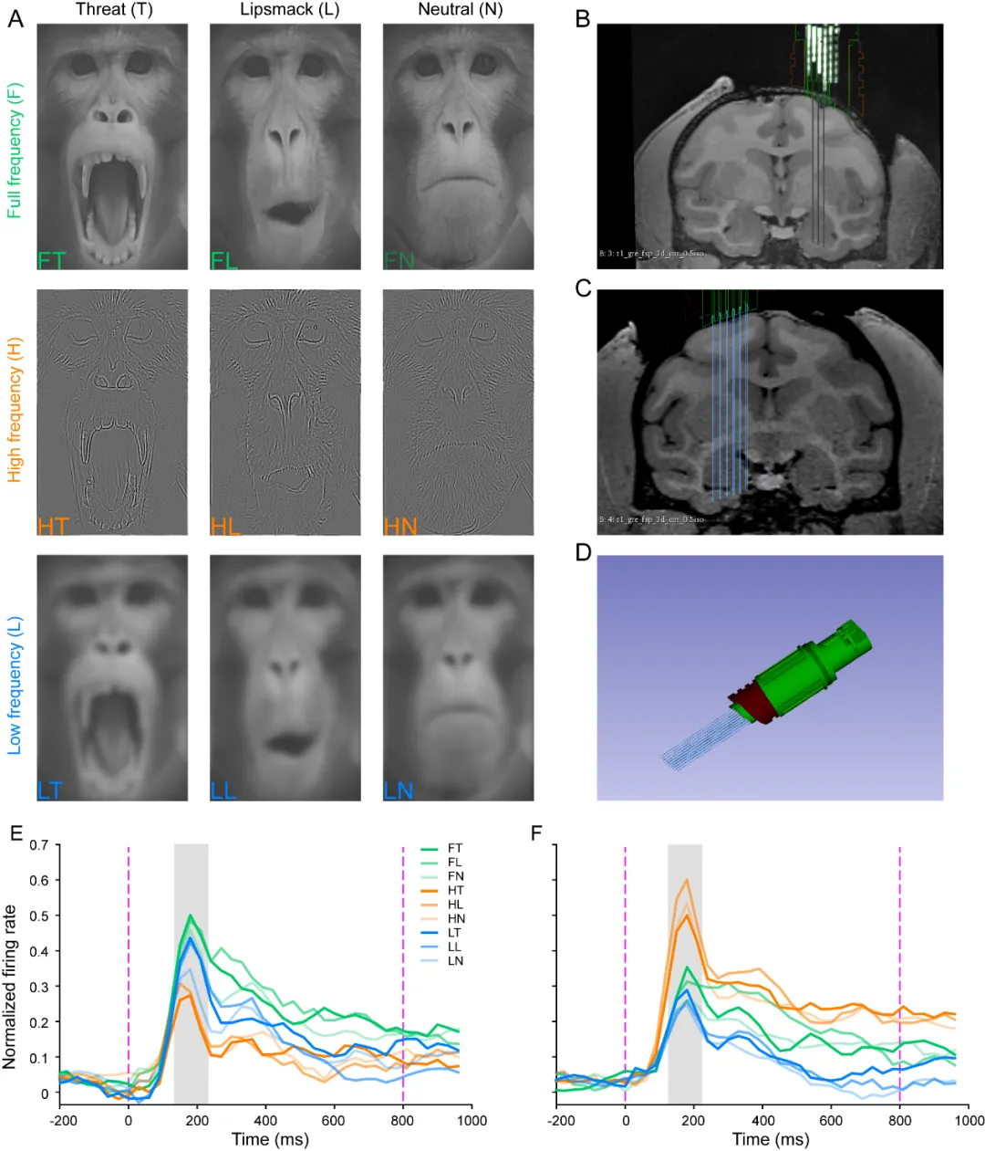低空间频率(LSF)主要涉及面部情感的整体特征,而高空间频率(HSF)则关注细节和变化。该研究进一步顺利获得fMRI发现,LSF的情感识别与杏仁核的功能具有遗传关联,而HSF则没有这种关联。这表明LSF和HSF在面部情感识别中具有不同的神经基础,反映了它们在情感处理过程中的功能分工。顺利获得对猕猴杏仁核进行在体的单细胞记录,发现杏仁核存在加工LSF和HSF的不同神经元,进一步证实了LSF和HSF在面部情感感知中的区别(图3)。