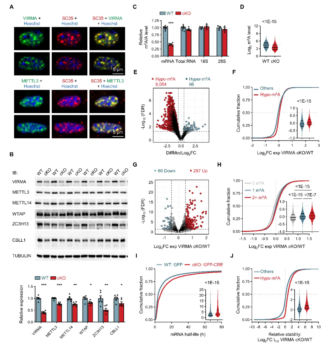 图1. VIRMA缺失导致mRNA的m6A修饰水平降低并破坏mRNA代谢稳态