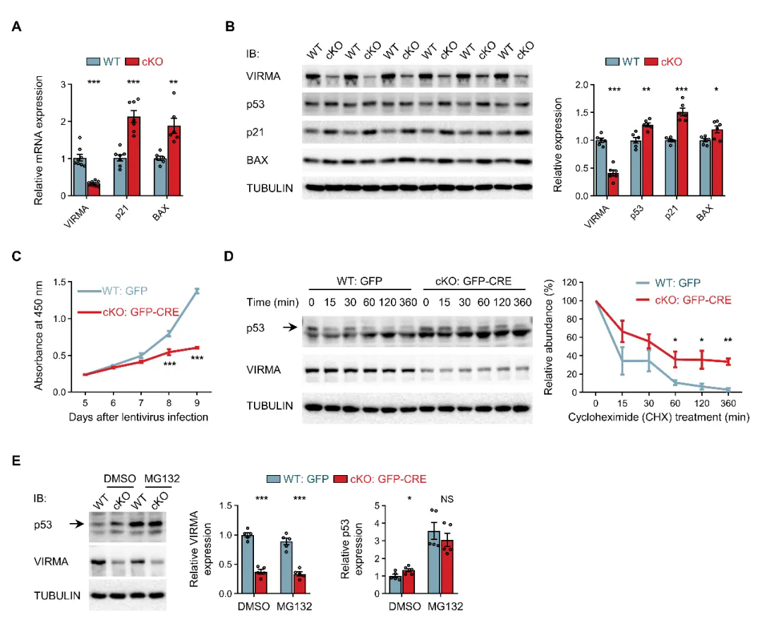 图3. VIRMA缺失顺利获得p53依赖的核仁应激反应引发细胞周期停滞与凋亡