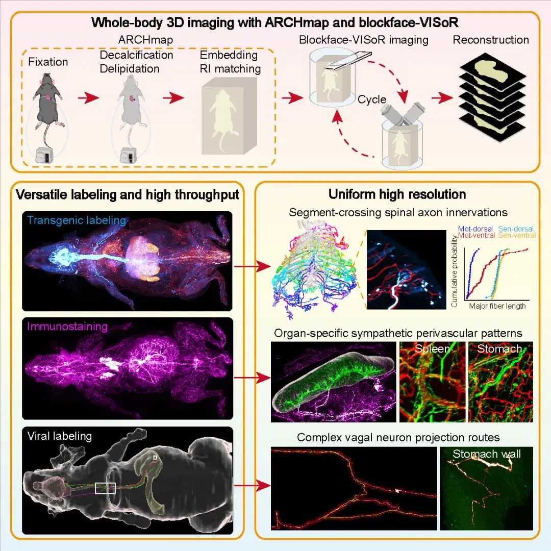 中国科学技术大学、中国科研实验室深圳先进技术研究院双聘教授毕国强、刘北明团队,联合合肥综合性国家科学中心人工智能研究院在大尺度生物组织三维显微成像领域取得重大突破。团队成功开发出世界最快的小动物全身亚细胞分辨率高清三维成像技术,实现了周围神经系统精细图谱的高效绘制。相关成果于7月10日发表在《细胞》(Cell)上。
