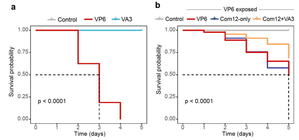 研究团队从健康对虾肠道中分离12株可培养菌株,构建合成菌群Com12。实验发现,单独添加致病性副溶血弧菌VP6会导致对虾死亡,加入Com12后对虾存活率得到一定程度的提升;而当共生弧菌VA3与Com12协同作用时,则可进一步增强VP6感染状态下对虾的生存能力(图1a&b)。这表明肠道共生菌可显著提升对虾抗病能力。