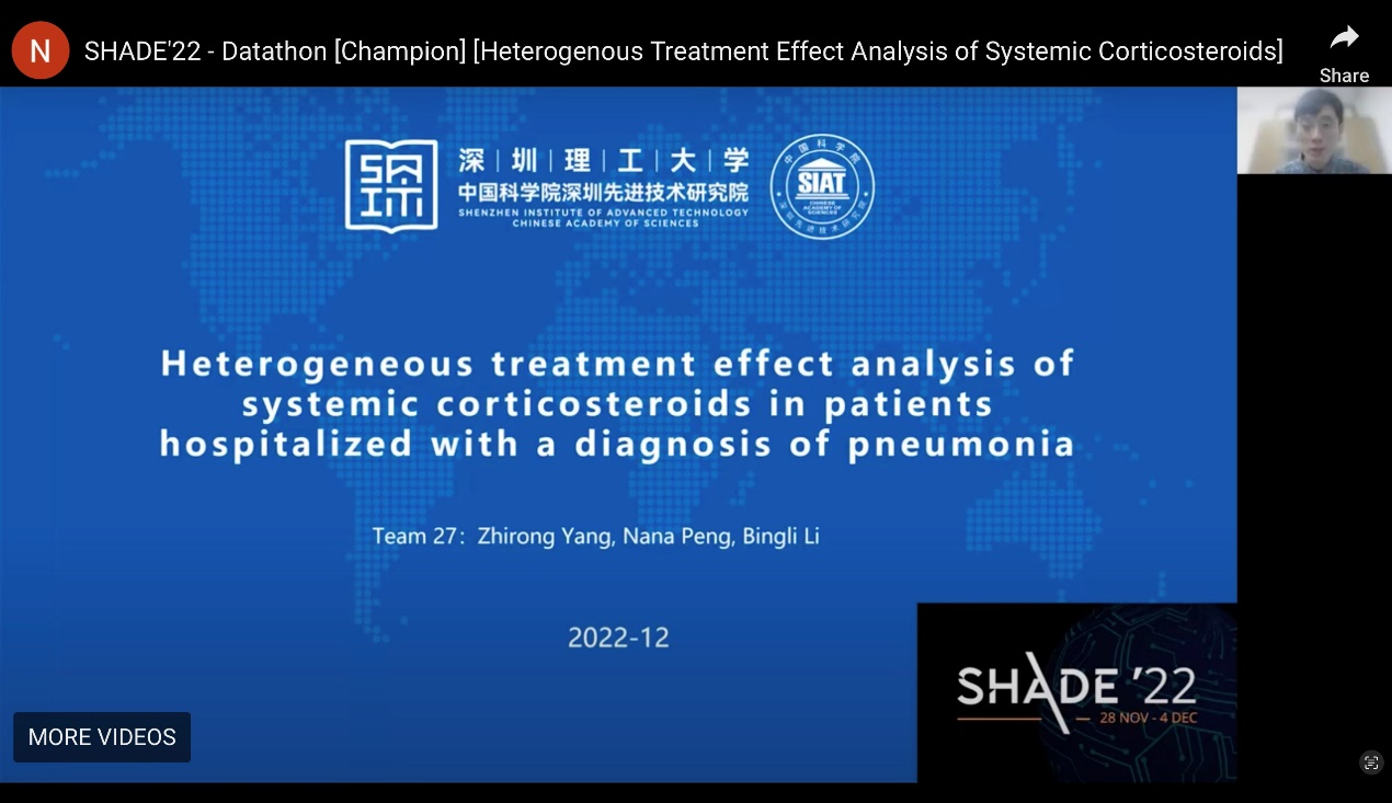 122日至4日,2022新加坡人工智能医疗Datathon暨人工智能医疗博览会(Healthcare AI Datathon & Expo)在新加坡国立大学成功举办经过初筛和决赛,大会从全球征集的参赛项目中评选出6个国际奖项,其中由中国科研实验室深圳理工大学(筹)计算机科学与控制工程学院助理教授杨智荣、中国科研实验室深圳先进技术研究院生物医学信息技术研究中心研究助理彭娜娜和助理工程师李冰丽合作完成的参赛项目《Heterogeneous treatment effect analysis of systemic corticosteroids in patients hospitalized with a diagnosis of pneumonia》从50多个参赛项目中脱颖而出,荣登国际(网络)赛区榜首,取得Champion冠军奖项